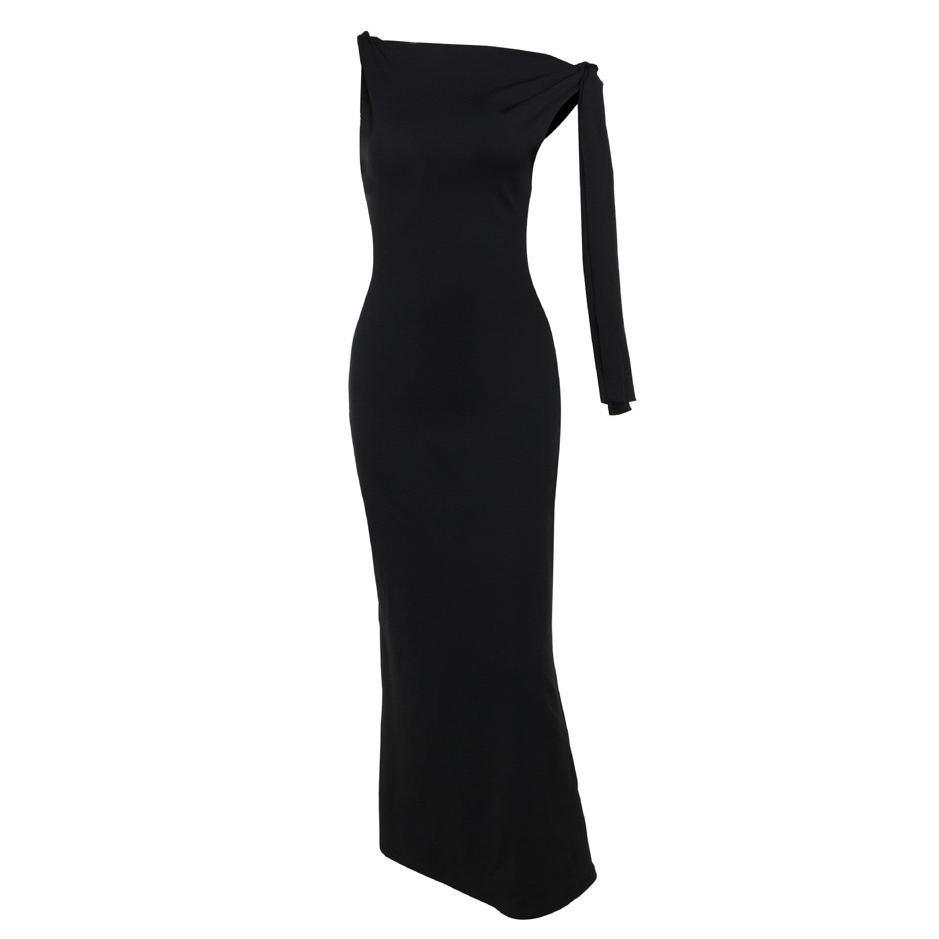 A sophisticated one-shoulder dress with a ribbon accent, designed to flatter the figure with its slim fit and sleek pullover design. Crafted from smooth polyester, this piece is ideal for evening events and special occasions. Available in black and light apricot.